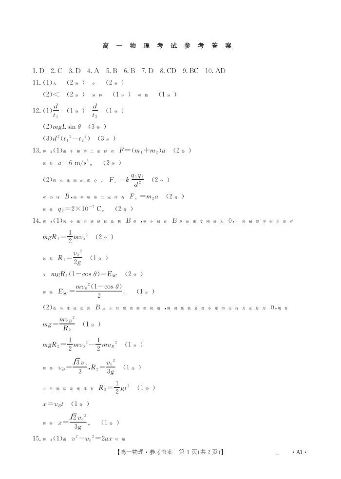 高一物理A1答案--内蒙古2024-2025学年高一下学期7月联考