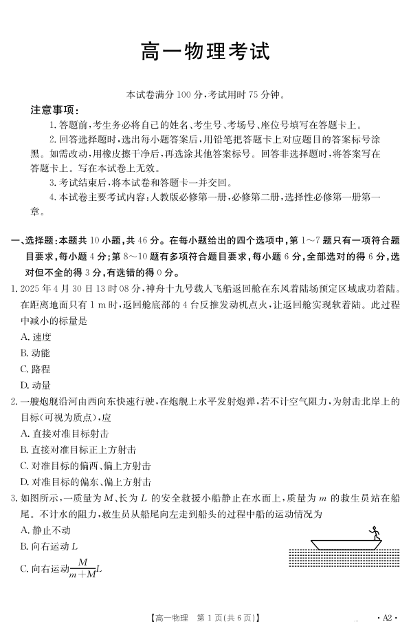 高一物理A2--内蒙古2024-2025学年高一下学期7月联考