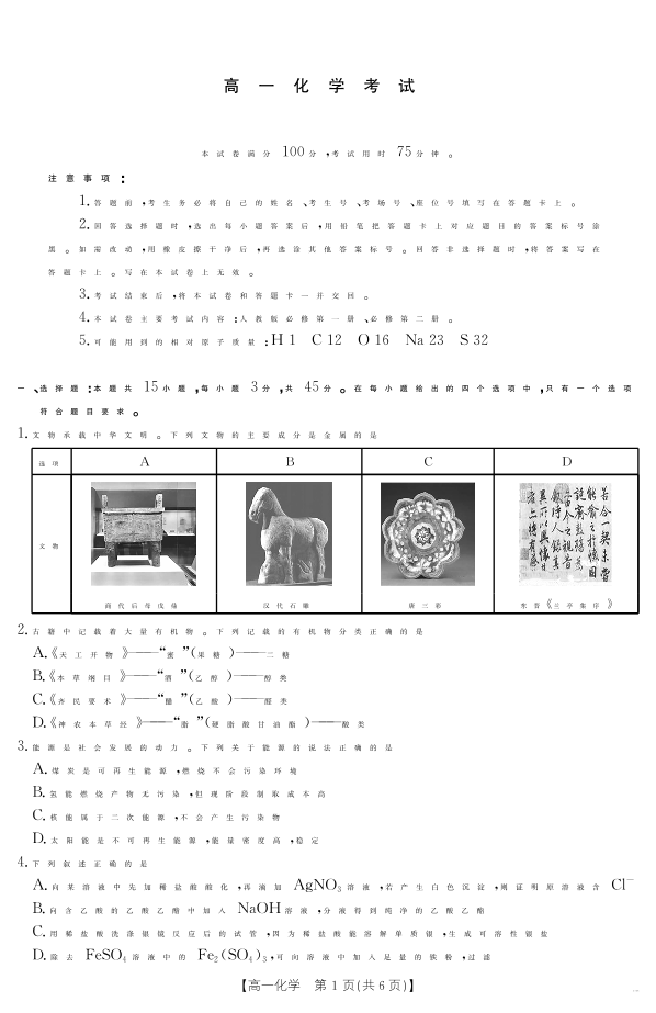高一化学--内蒙古2024-2025学年高一下学期7月联考