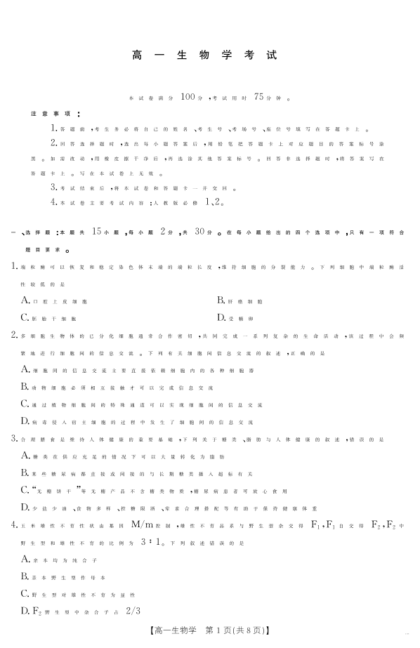 高一生物--内蒙古2024-2025学年高一下学期7月联考