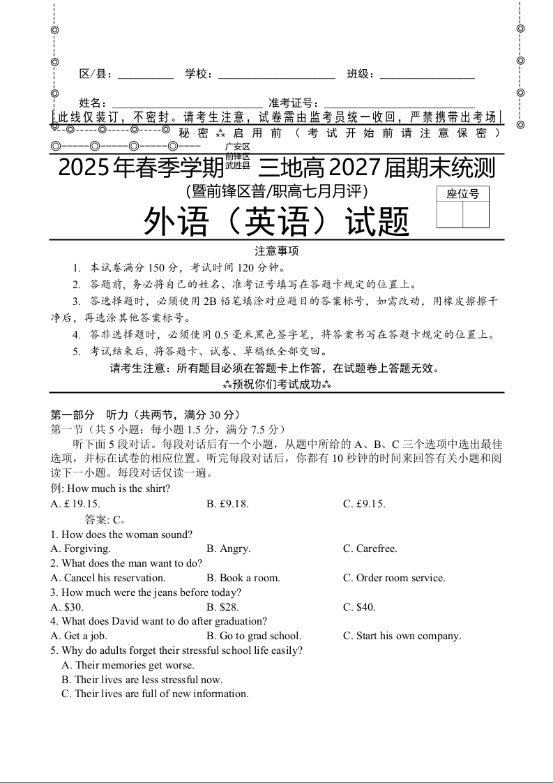 高一英语+答案--四川省广安市广安区等3地2024-2025学年高一下学期7月期末统测