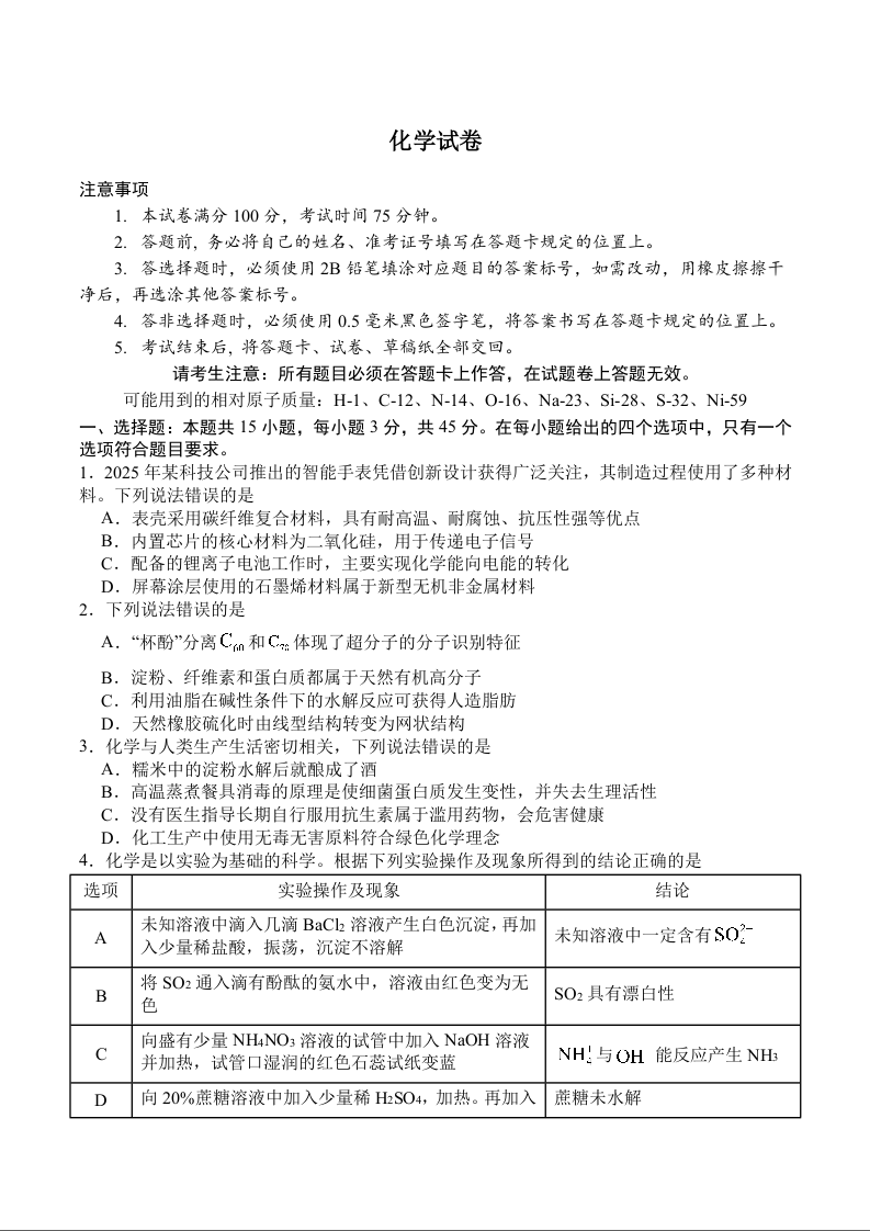 高一化学+答案--四川省广安市广安区等3地2024-2025学年高一下学期7月期末统测