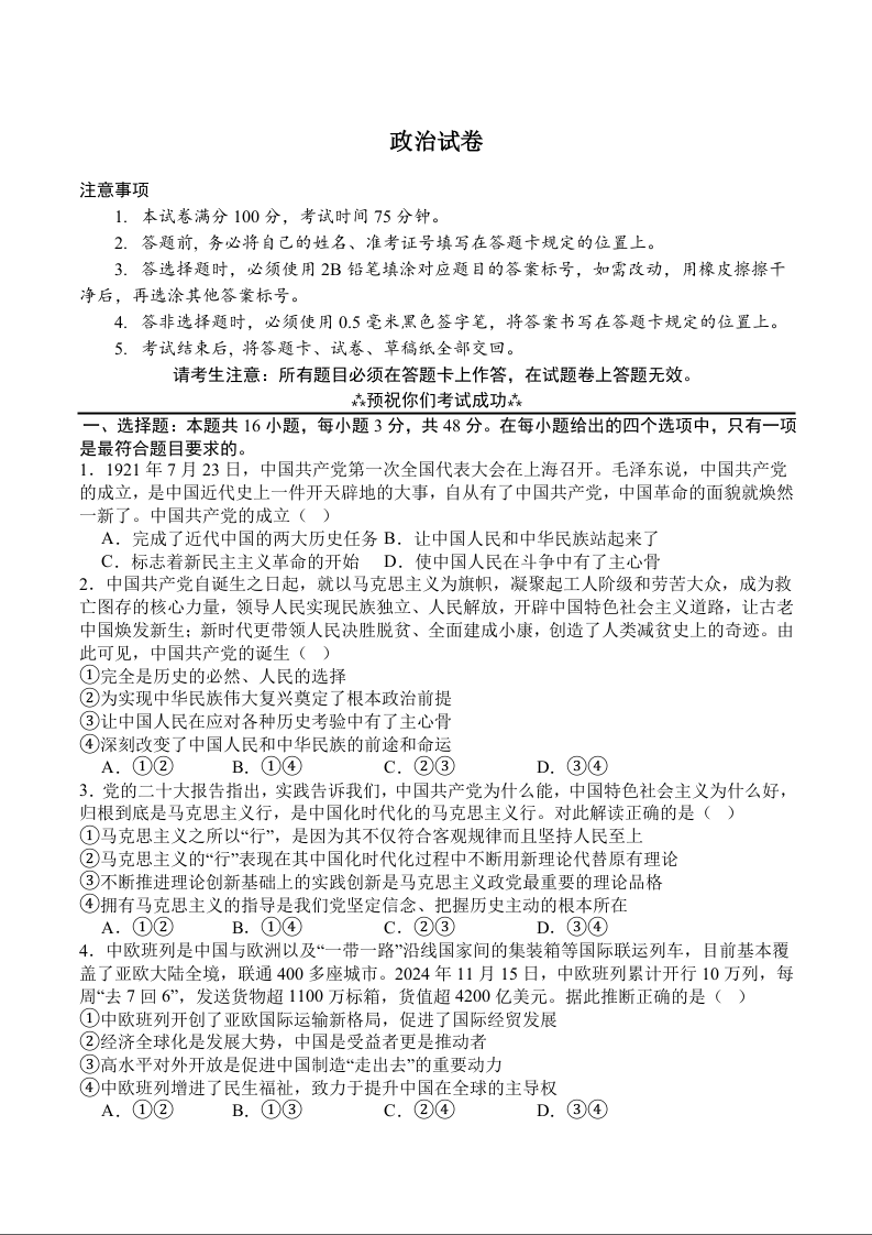 高一政治+答案--四川省广安市广安区等3地2024-2025学年高一下学期7月期末统测
