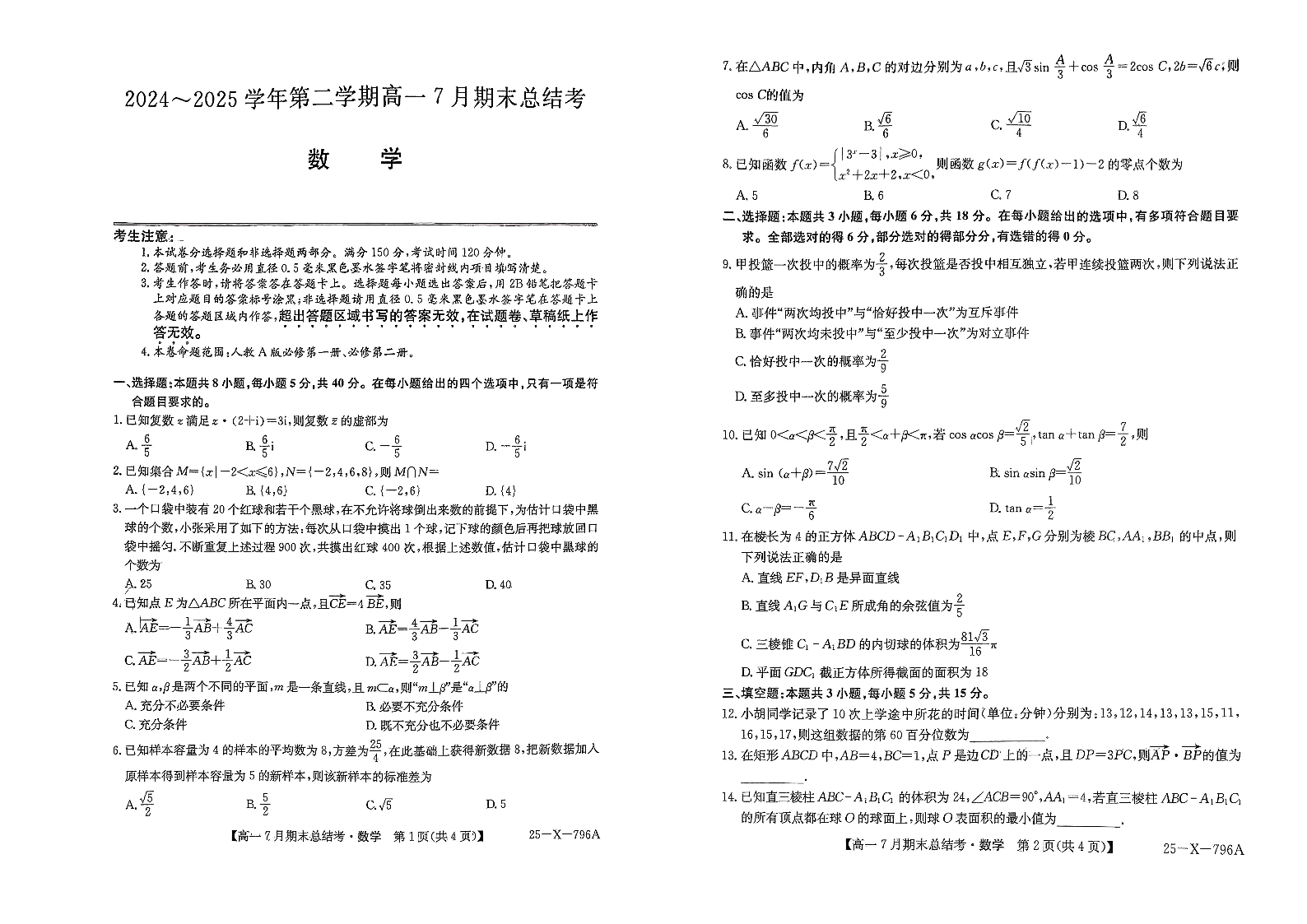 高一数学+答案--山西省三晋卓越联盟2024-2025学年高一下学期7月期末总结考