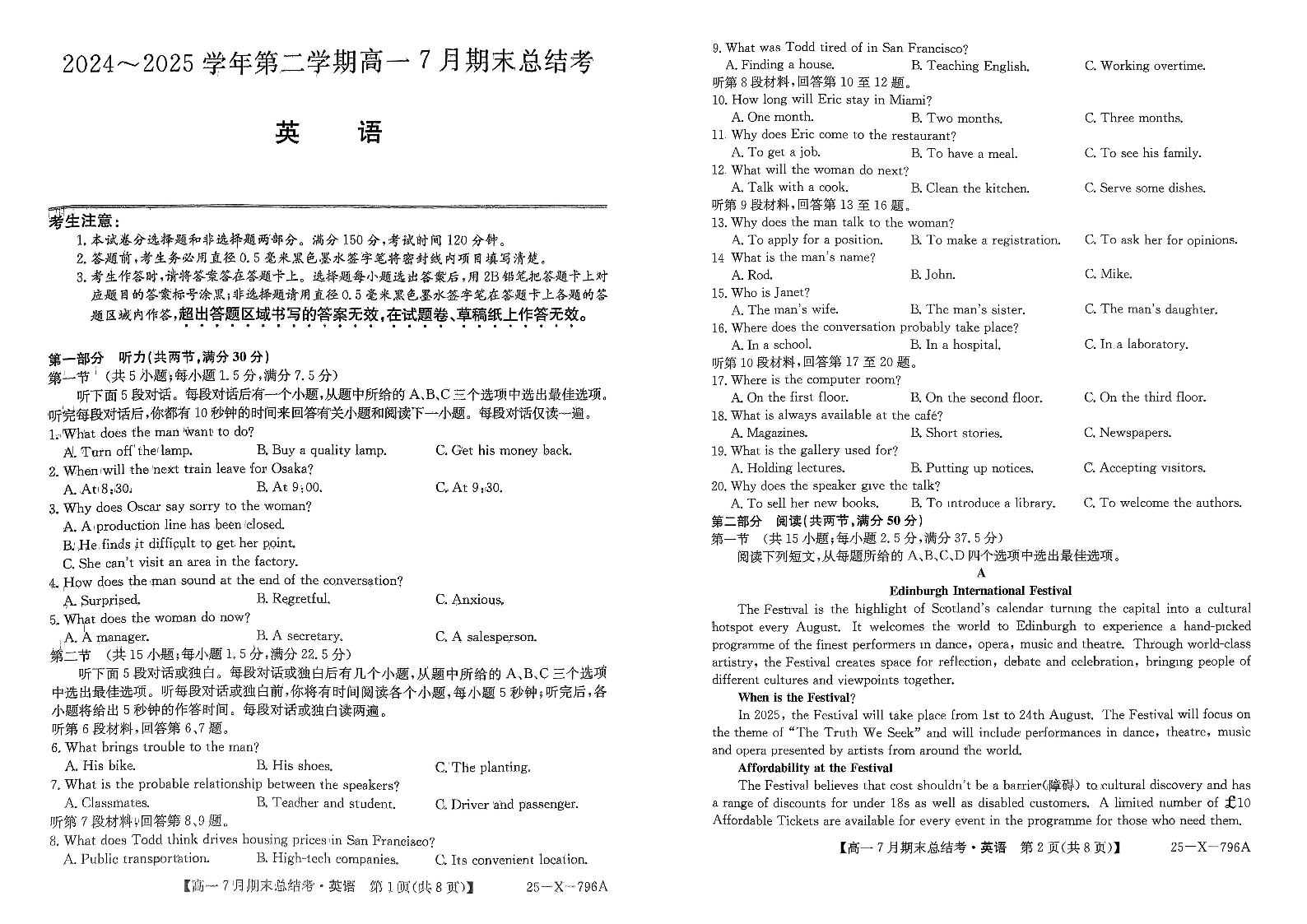 高一英语+答案--山西省三晋卓越联盟2024-2025学年高一下学期7月期末总结考