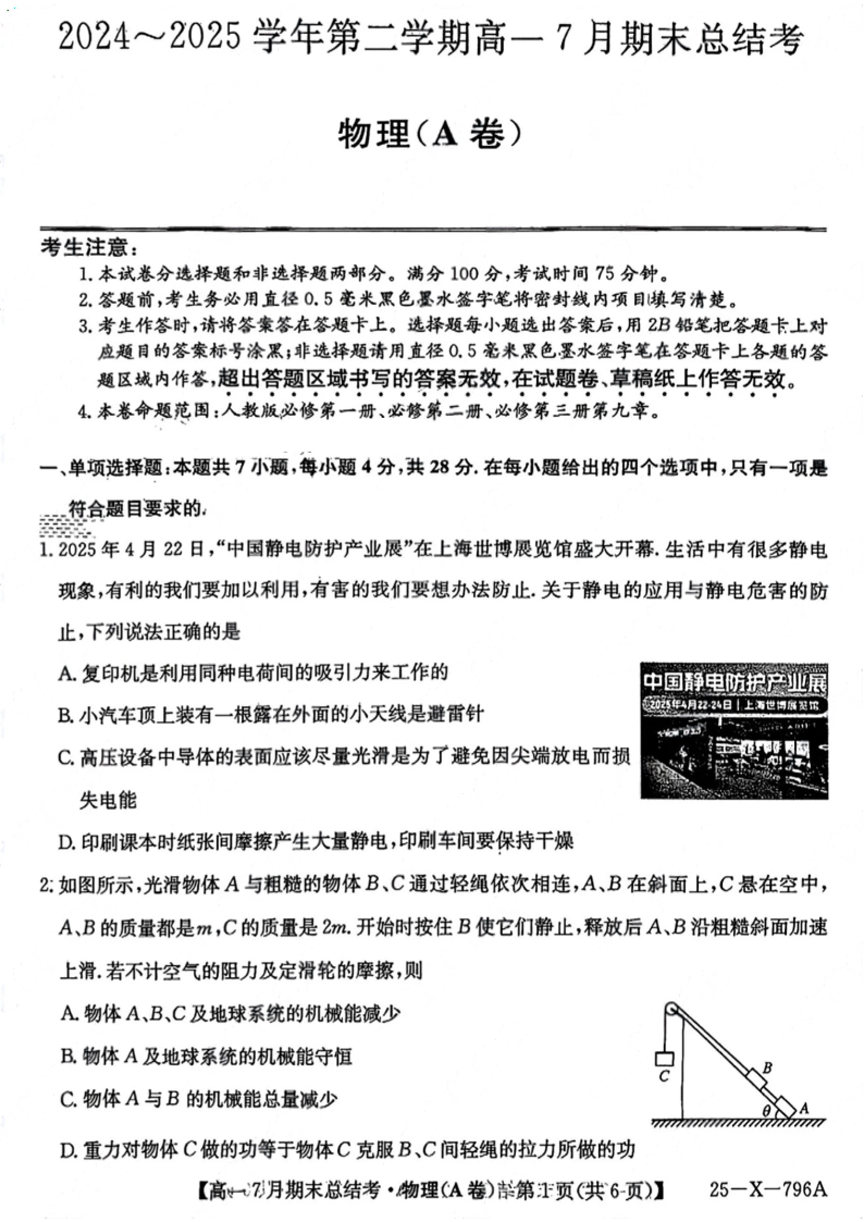 高一物理+答案--山西省三晋卓越联盟2024-2025学年高一下学期7月期末总结考