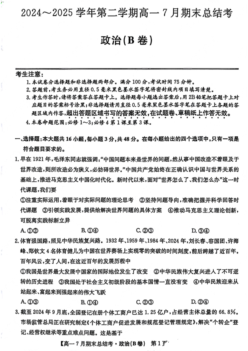高一政治+答案--山西省三晋卓越联盟2024-2025学年高一下学期7月期末总结考