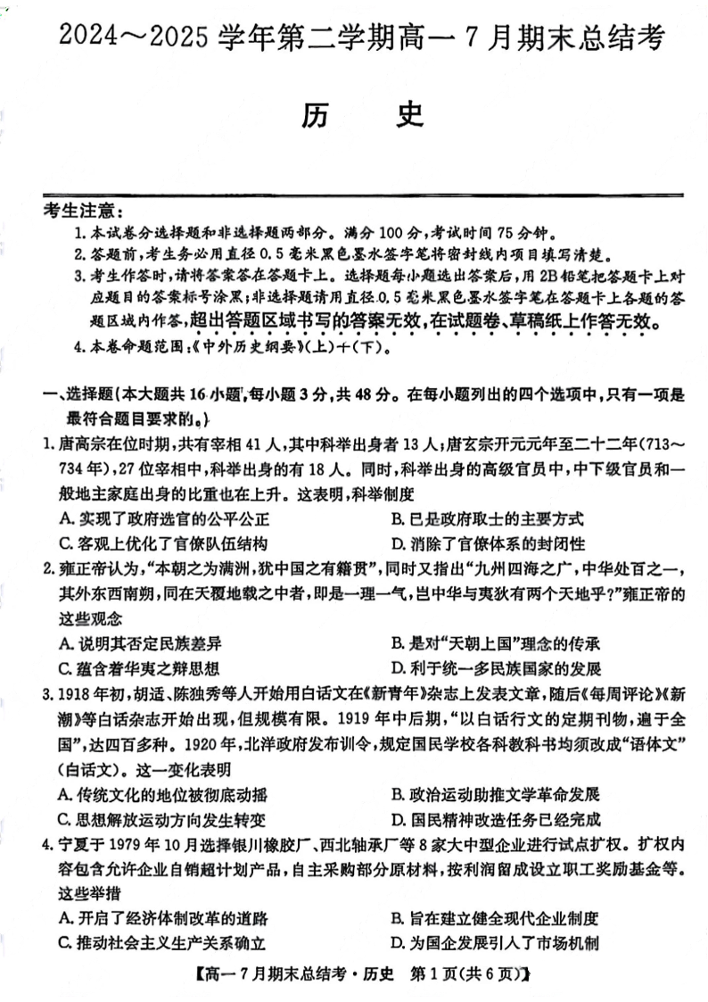 高一历史+答案--山西省三晋卓越联盟2024-2025学年高一下学期7月期末总结考