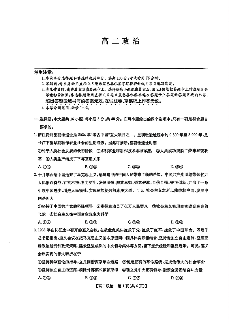 高二政治+答案--辽宁省九师联盟2024-2025学年高二下学期7月期末联考