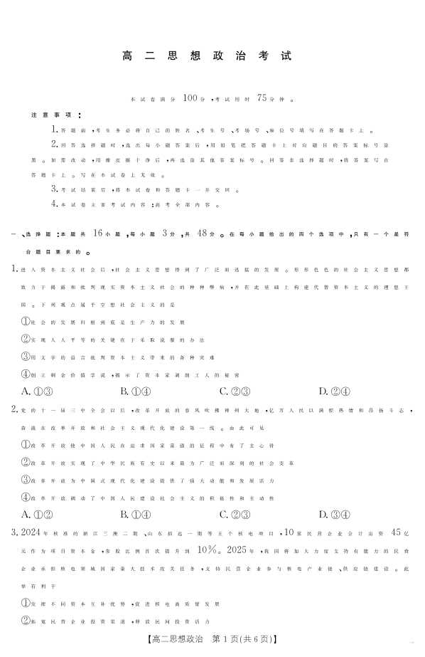 高二政治--内蒙古2024-2025学年高二下学期7月联考