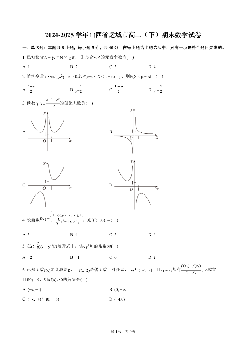 高二数学+答案--山西省运城市2024-2025学年高二下学期期末调研测试