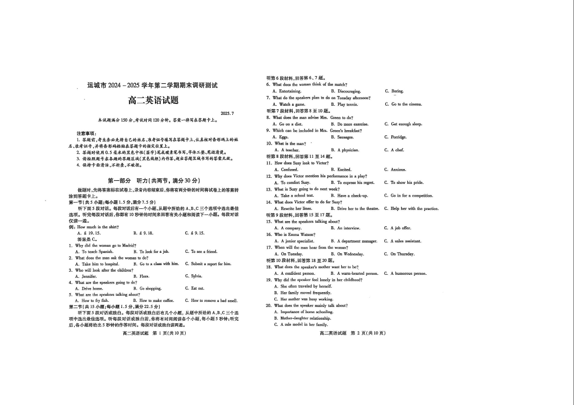 高二英语+答案--山西省运城市2024-2025学年高二下学期期末调研测试
