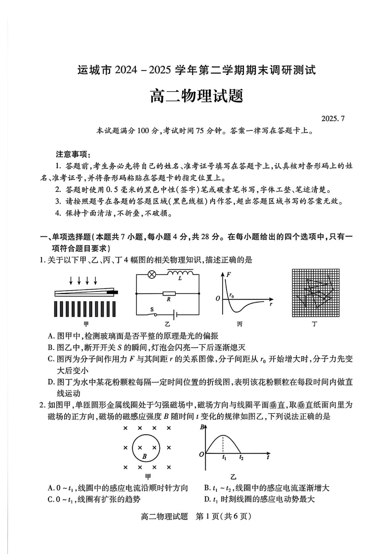 高二物理+答案--山西省运城市2024-2025学年高二下学期期末调研测试
