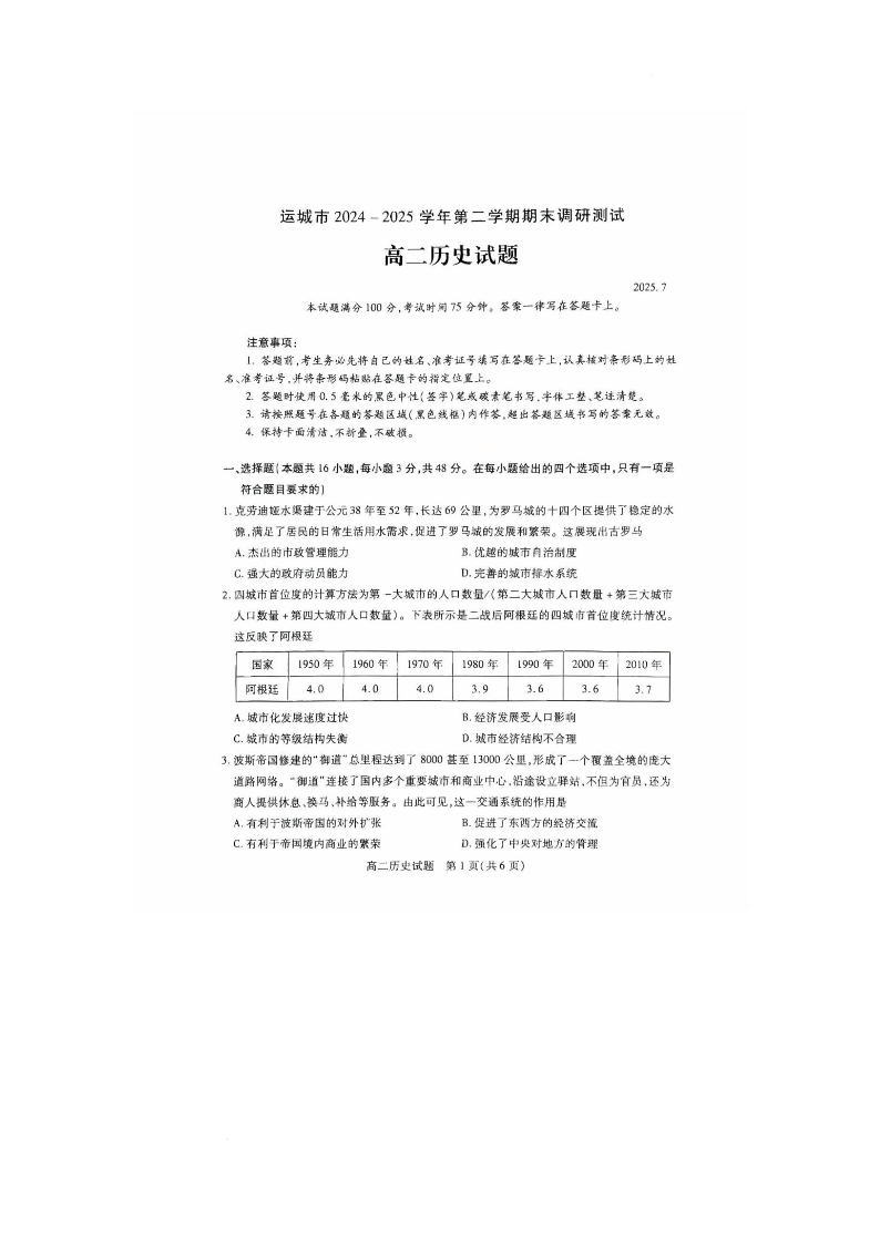 高二历史+答案--山西省运城市2024-2025学年高二下学期期末调研测试