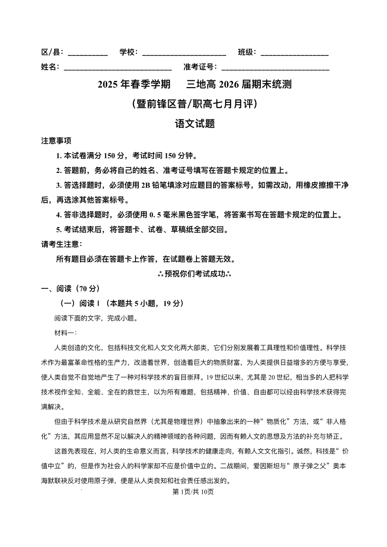 高二语文+答案--四川省广安市广安区等3地2024-2025学年高二下学期7月期末考试
