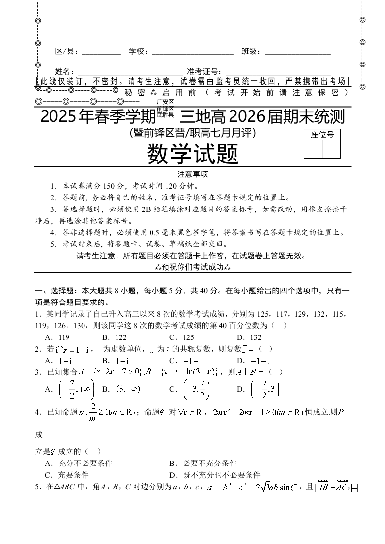 高二数学+答案--四川省广安市广安区等3地2024-2025学年高二下学期7月期末考试