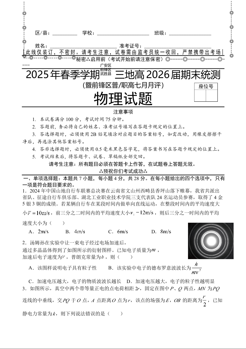 高二物理+答案--四川省广安市广安区等3地2024-2025学年高二下学期7月期末考试