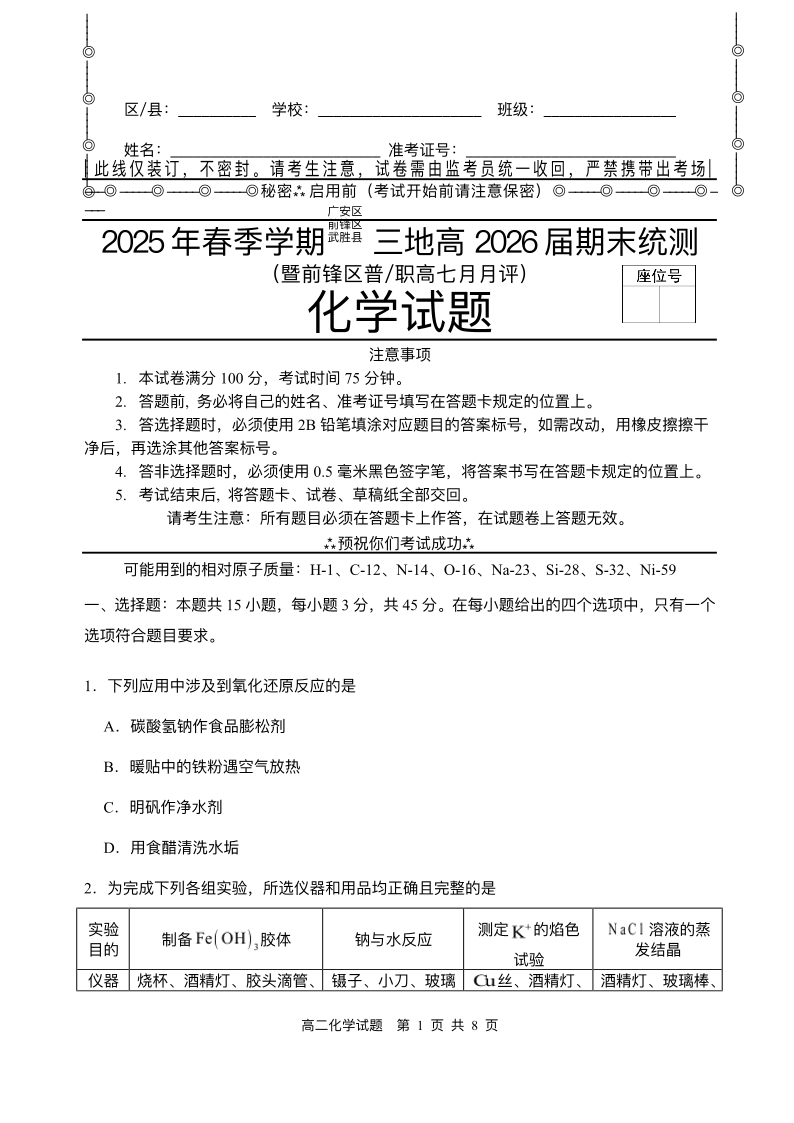 高二化学+答案--四川省广安市广安区等3地2024-2025学年高二下学期7月期末考试