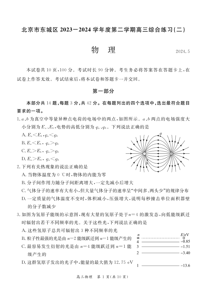 北京东城区2024届高三二模物理+答案