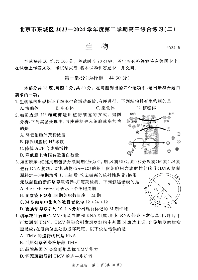 北京东城区2024届高三二模生物+答案