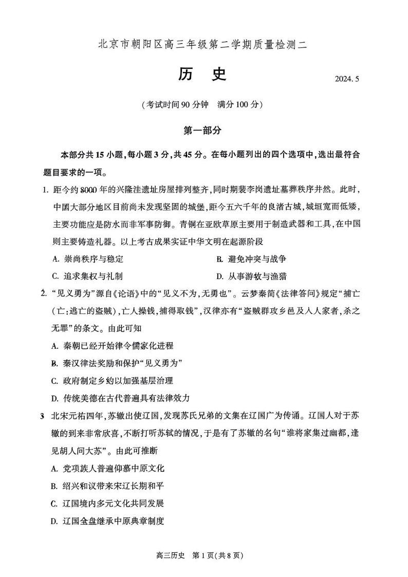 北京市朝阳区2024届高三二模历史+答案