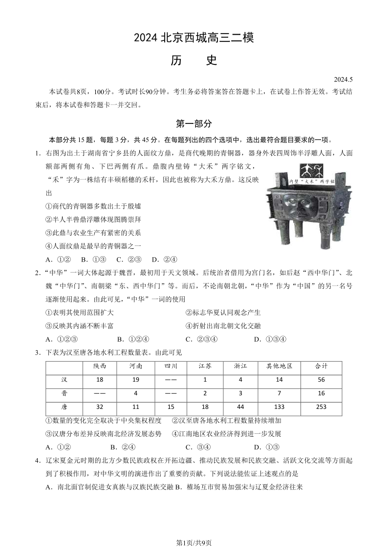 北京市西城区2024届高三二模历史+答案