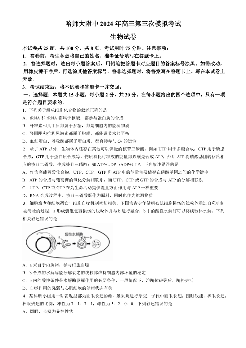 东北三省三校2024届高三下学期第三次联合模拟考生物