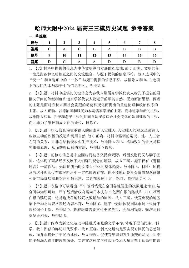 东北三省三校2024届高三下学期第三次联合模拟考历史答案