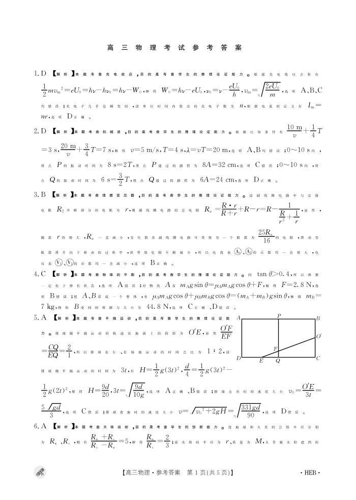 河北省保定市九校2024届高三下学期二模物理答案