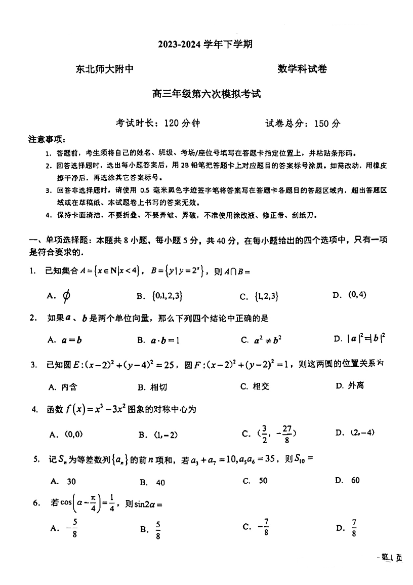 吉林省长春市东北师范大学附属中学2024届高三下学期第六次模拟考试数学