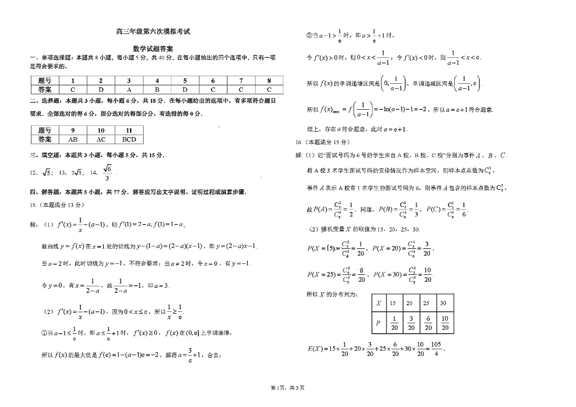 吉林省长春市东北师范大学附属中学2024届高三下学期第六次模拟考试数学答案