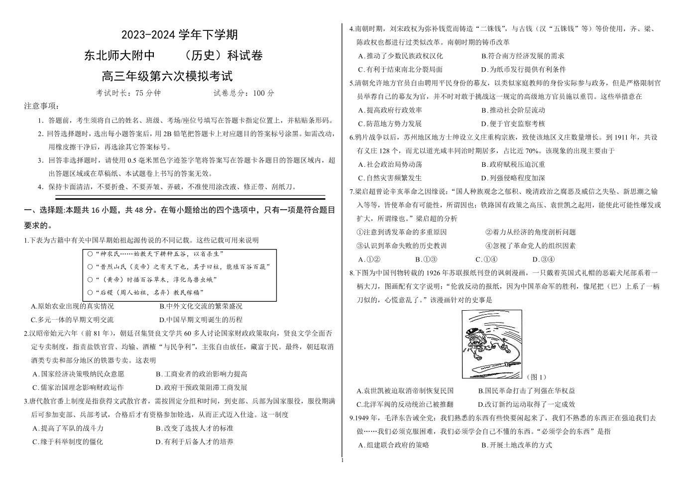吉林省长春市东北师范大学附属中学2024届高三下学期第六次模拟考试历史