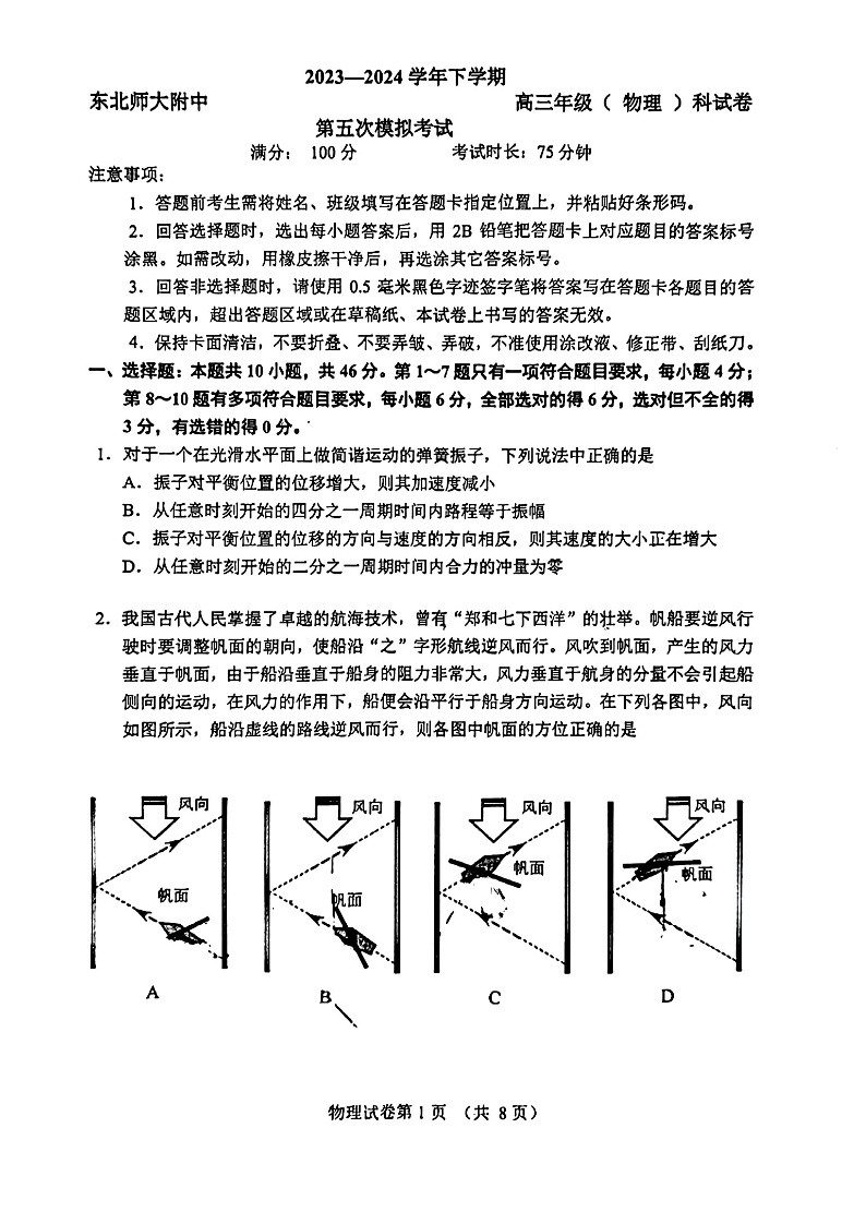 吉林省长春市东北师范大学附属中学2024届高三下学期第五次模拟考试物理