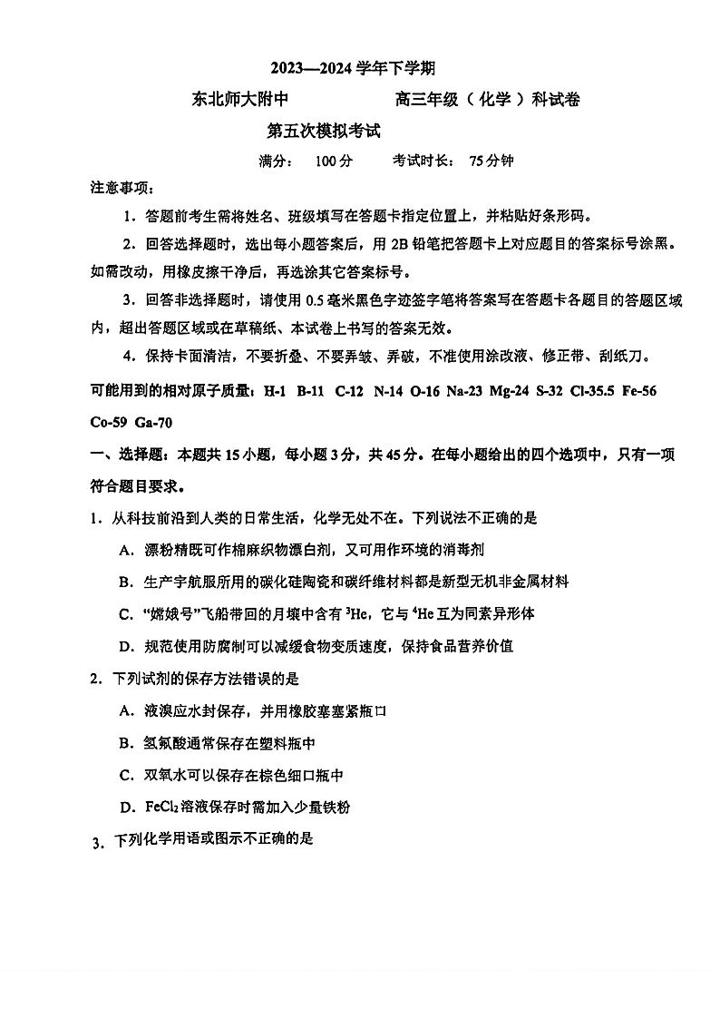 吉林省长春市东北师范大学附属中学2024届高三下学期第五次模拟考试化学+答案