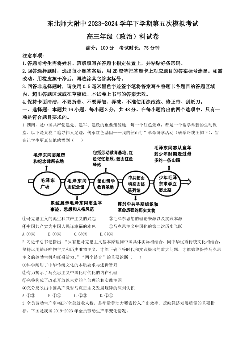 吉林省长春市东北师范大学附属中学2024届高三下学期第五次模拟考试政治