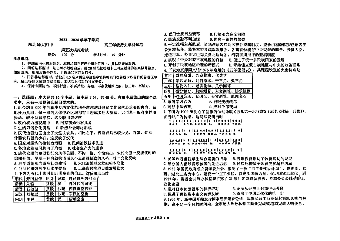 吉林省长春市东北师范大学附属中学2024届高三下学期第五次模拟考试历史