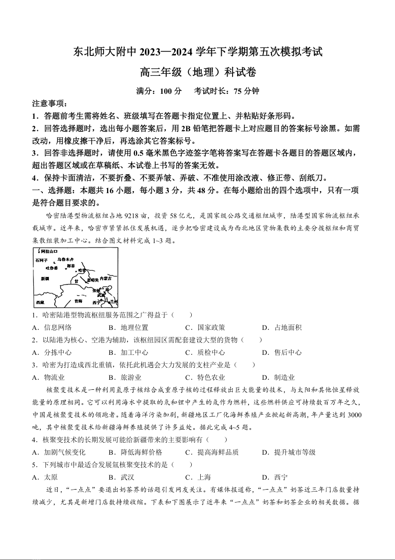 吉林省长春市东北师范大学附属中学2024届高三下学期第五次模拟考试地理