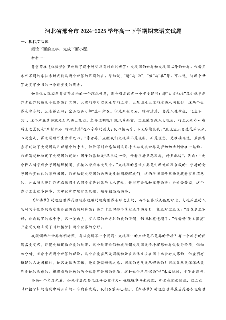 高一语文+答案--河北省邢台市2024-2025学年高一下学期7月金太阳期末测试