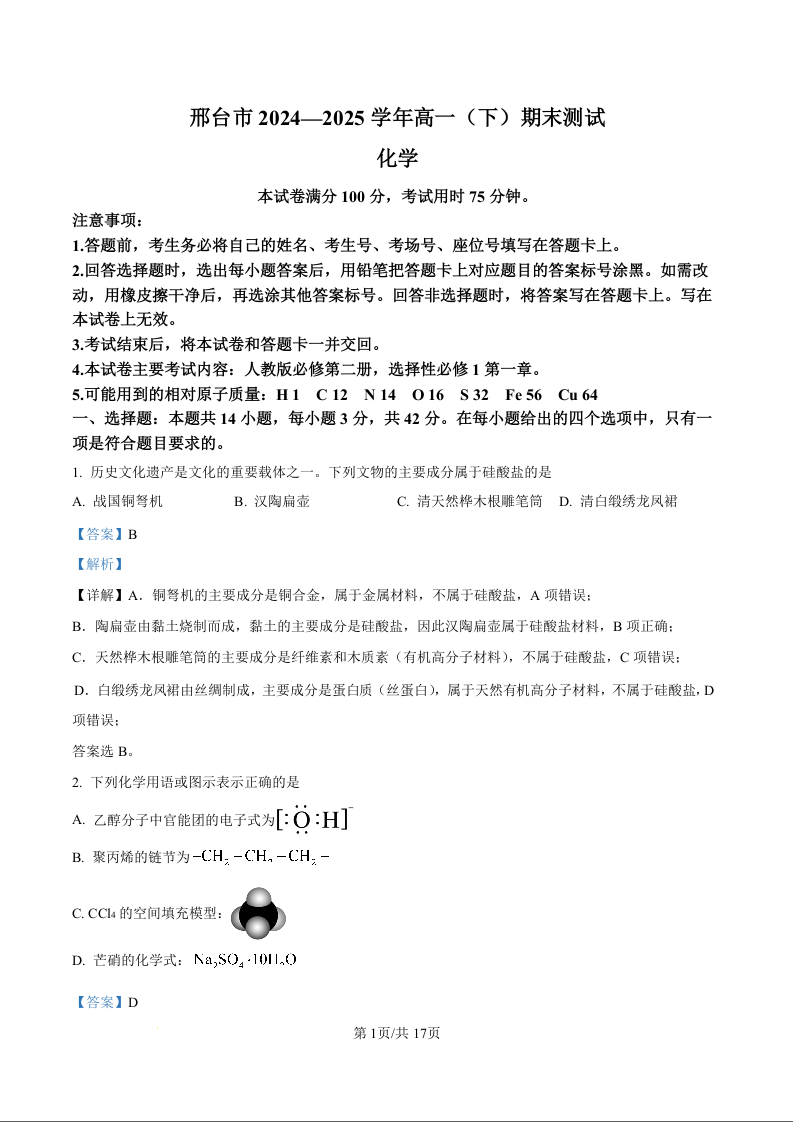 高一化学解析版--河北省邢台市2024-2025学年高一下学期7月金太阳期末测试