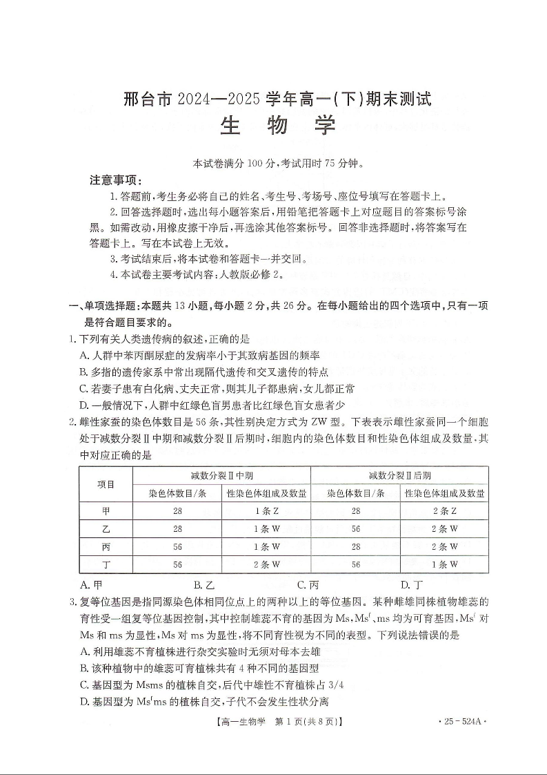 高一生物--河北省邢台市2024-2025学年高一下学期7月金太阳期末测试
