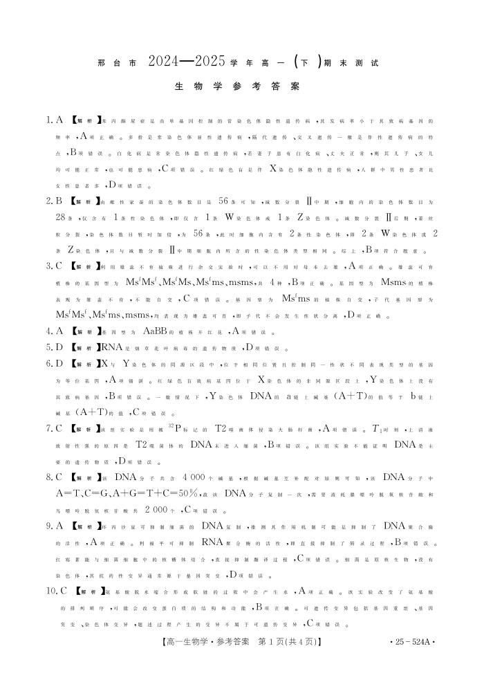 高一生物答案--河北省邢台市2024-2025学年高一下学期7月金太阳期末测试