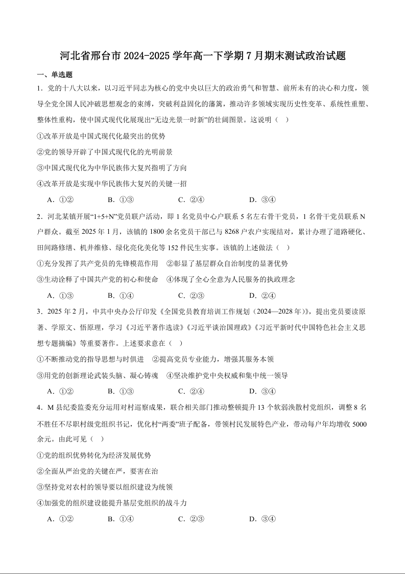 高一政治+答案--河北省邢台市2024-2025学年高一下学期7月金太阳期末测试