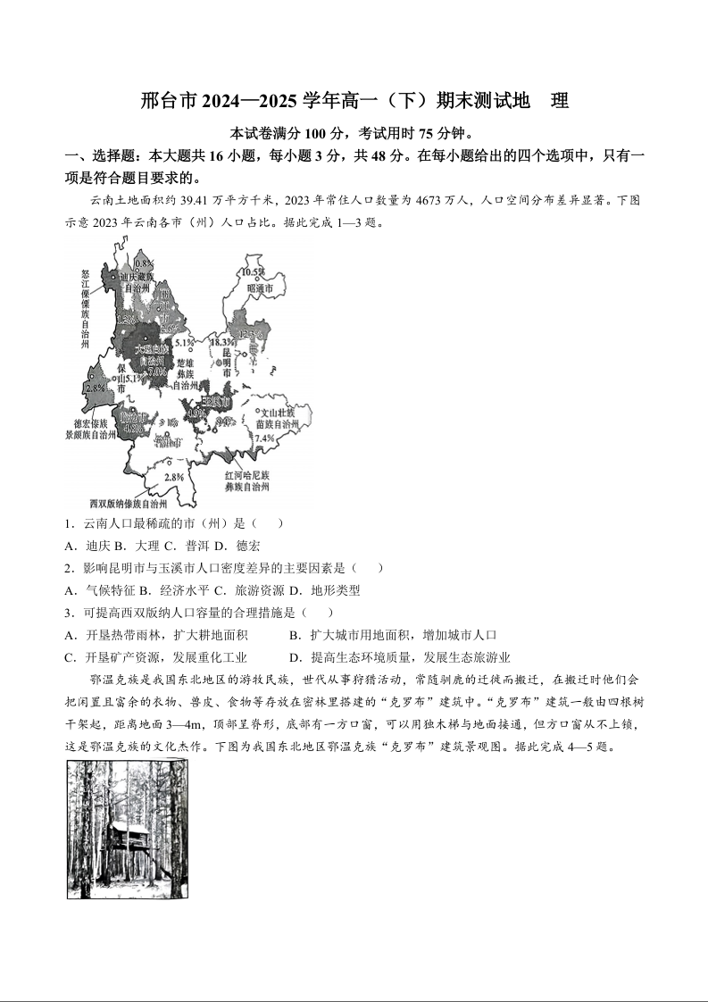 高一地理--河北省邢台市2024-2025学年高一下学期7月金太阳期末测试