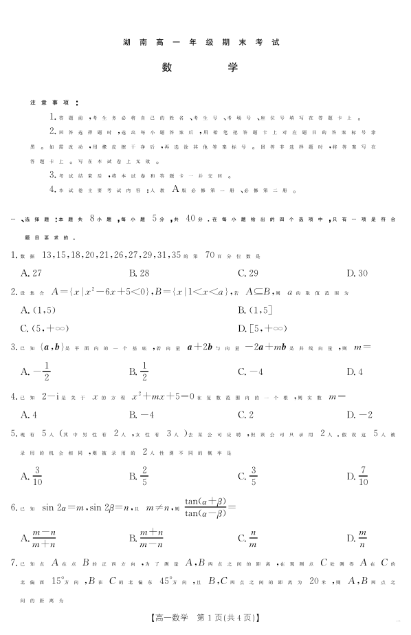 高一数学--湖南省耒阳市2024-2025学年高一年级下学期7月期末考试