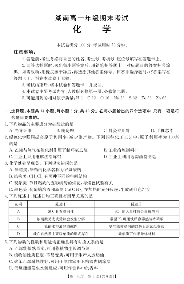 高一化学--湖南省耒阳市2024-2025学年高一年级下学期7月期末考试