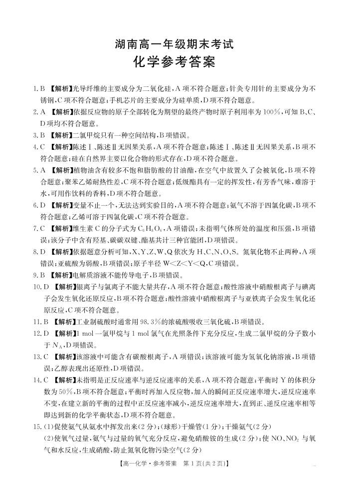 高一化学答案--湖南省耒阳市2024-2025学年高一年级下学期7月期末考试
