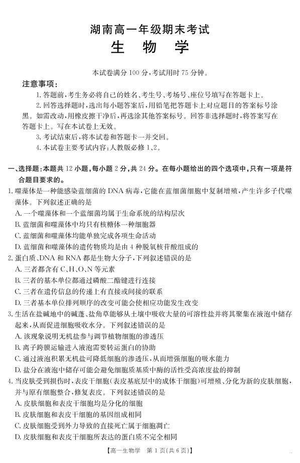 高一生物--湖南省耒阳市2024-2025学年高一年级下学期7月期末考试