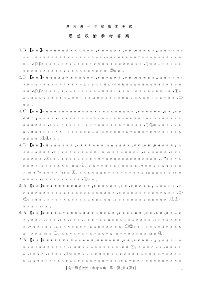 高一政治答案--湖南省耒阳市2024-2025学年高一年级下学期7月期末考试
