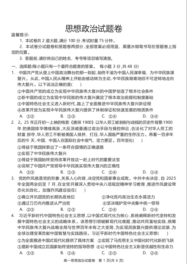 高一政治--湖南省邵阳市新邵县2024-2025学年高一下学期期末质量检测