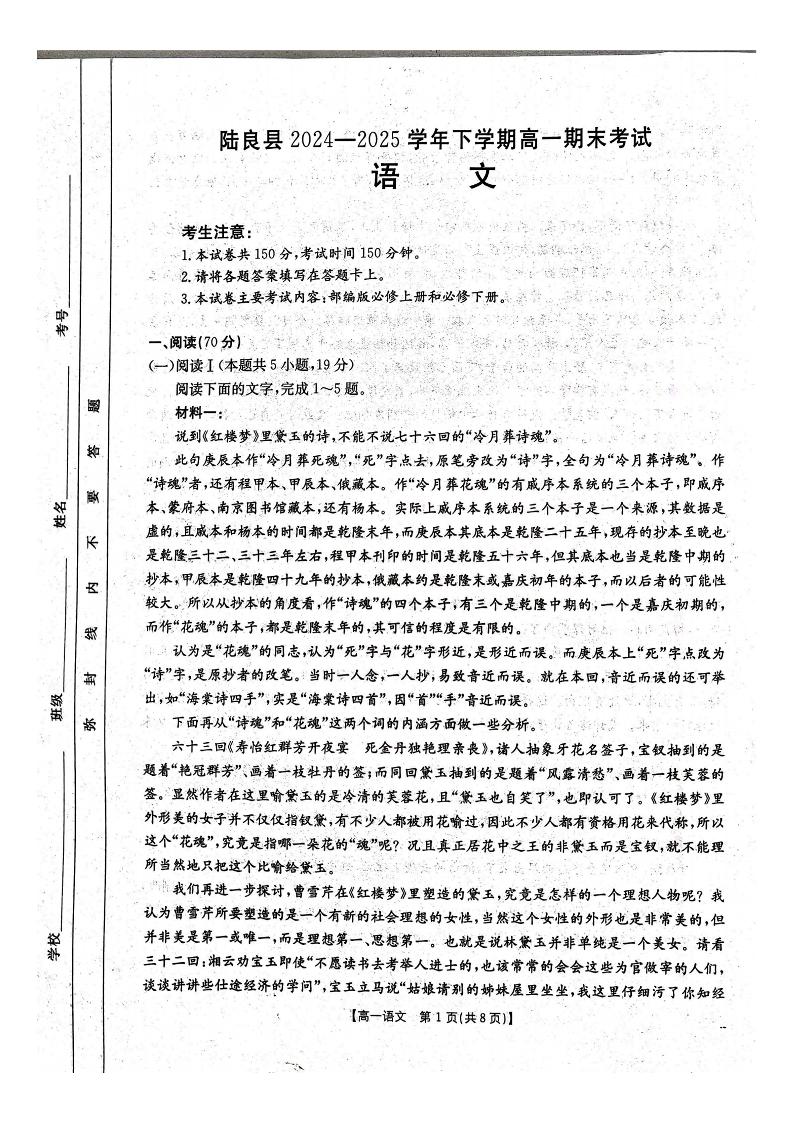 高一语文--云南省曲靖市陆良县2024-2025学年高一下学期期末考试